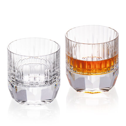 Crystal whiskey tumblers with diamond-like refraction and a rotatable spherical base—made to sparkle, swirl, and feel satisfyingly substantial.